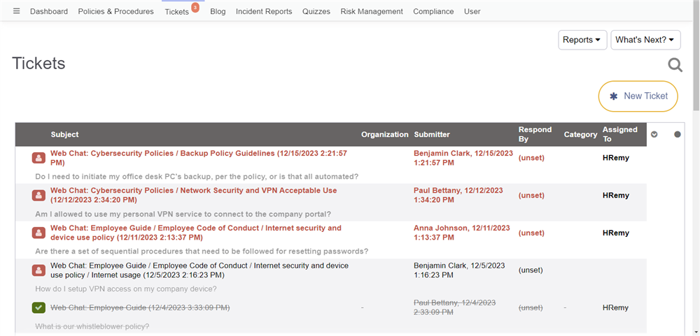 The Ticket System is used to manage any questions that arise about policies, procedures or other articles. Every conversation started through the web chat will create a ticket so it can be tracked. It can also be used to track general requests in your organization. Each of these queries or inquiries are called a ticket. All tickets can be found on the Tickets tab, as a list.