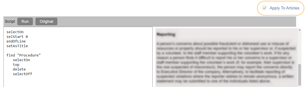 Here you will enter in the script on the left, and then click "Run" to test it and see the preview of the results on the right side. You can click Original at any time to show the original sample article.