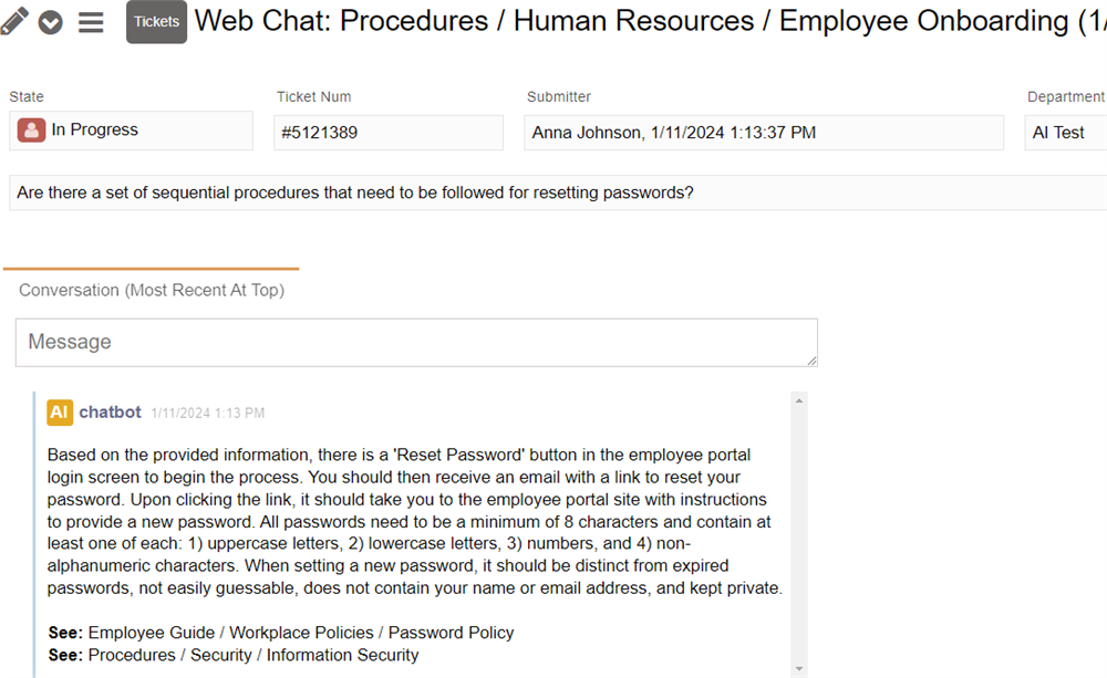 The chatbot response will look something like this in the ticket window: