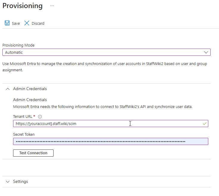 Next, the Secret Token should be the secret key that was provided by the "Setup SCIM" in your site application. This is used to authenticate access to the system. Incidentally, if you ever believe this key has been compromised, repeat the "Setup SCIM" action again to create a new key and invalidate the previous one. It may be a good idea to perform this operation on a regular basis for security reasons.