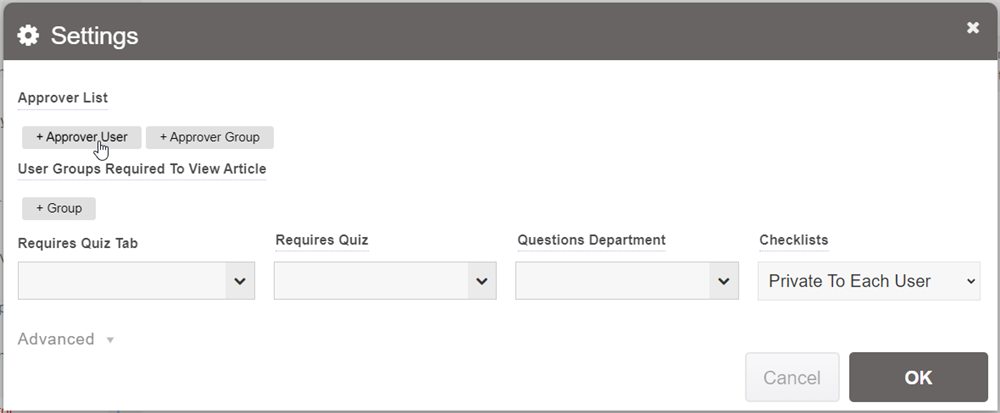 In this form you can specify any number of approvers, either users or user groups. When these are set then any changes to the article must be approved by all of those users. Note: if a parent article has approvers set, the list of inherited approvers will appear in the settings box.