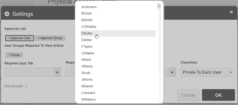 Note: Only Wiki Managers can be added as approvers. To make a user into a Wiki Manager, the Admin or User Manager will need to change the setting in that user's profile. See Setting Up Users and Wiki Manager Users.
