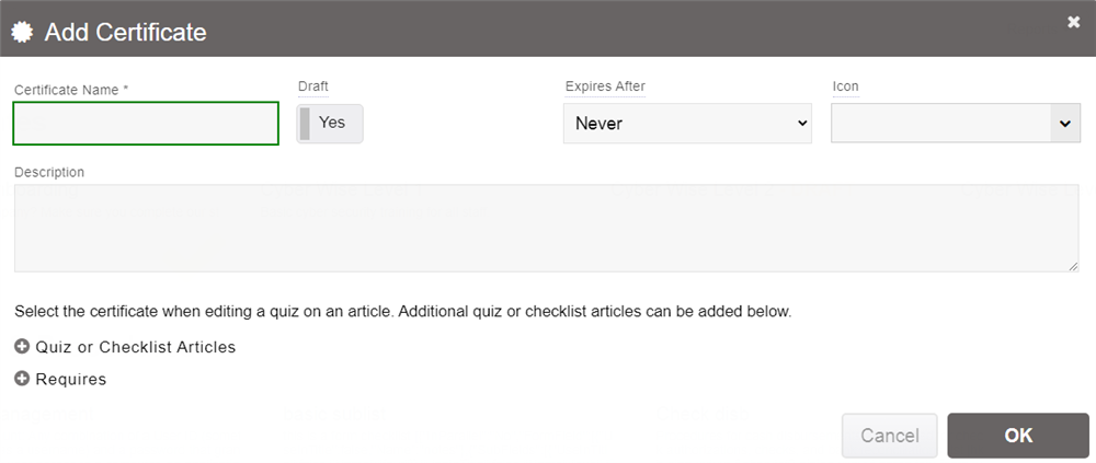 In addition to adding the quiz this way, you can also add a certificate simply by typing a name into a quiz's Certificate dropdown when editing the quiz in the article itself. This will automatically create the certificate and add the article to that certificate. You can then select that automatically added certificate from that same quiz editor for other articles to add those articles to the certificate also.