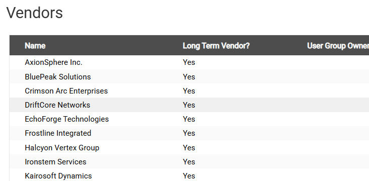 - Secondly, there's a list of actual vendors, clients and internal departments - each of which can be linked to a document defined group.