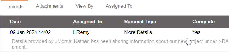 Every input request becomes a record assigned to the user it is requested from and remains so after they provide details. This means records created and assigned to each witness or consultant will not be viewable to one another, only ones assigned to themselves. The incident reporter will also not be able to view any input request record or input record made.