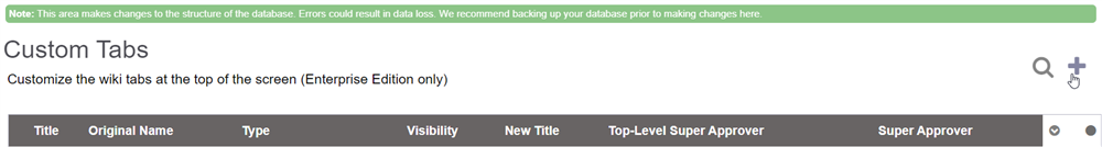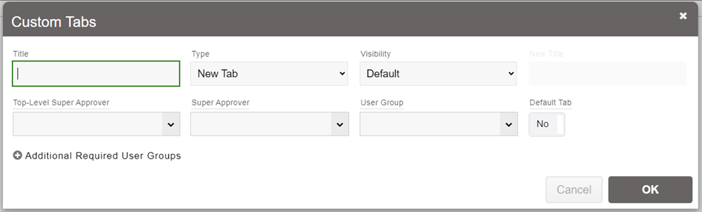 At a minimum, give a title to your custom tab, leave the Type to New Tab, and click OK. You can also set a Top-Level or Super Approver for the tab. This user will be required to review all article changes or insertions at the top-level of that specific tab's wiki, or for any level on that wiki tab, respectively.