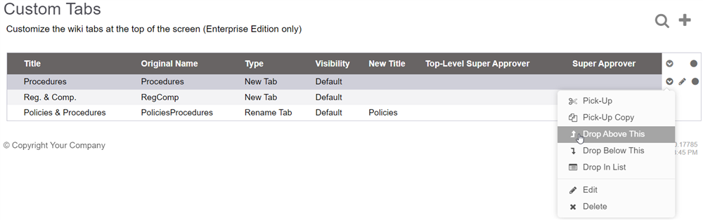 Click on either of the 3 options in the menu to proceed with the move. In the example shown above, the Internal Policies tab will be dropped in above the Testing tab.
