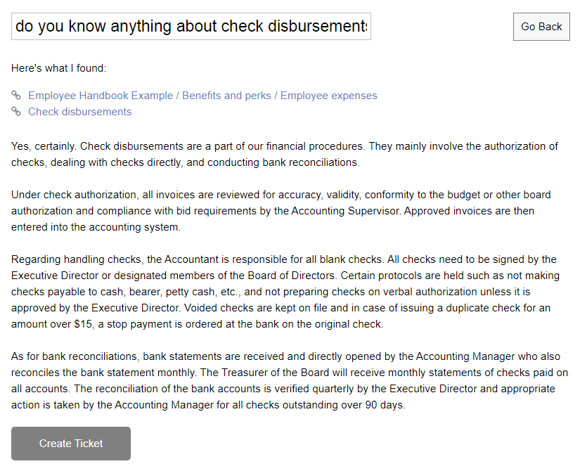 It will provide links to the articles it found, and at the bottom it will add a button to create a ticket to post the question to a human.