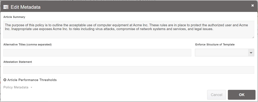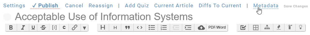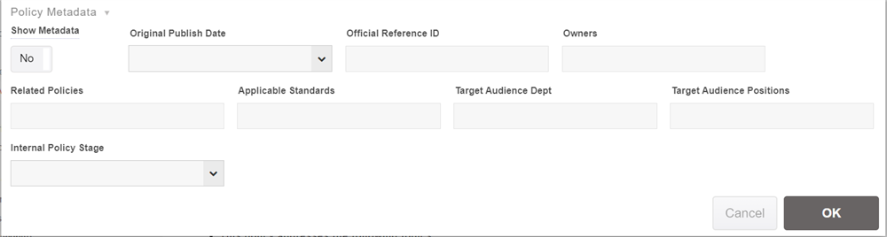At the bottom of the form is a section for Policy Metadata. In here you can specify optional information that pertains more to policies - such as the original publication date, who the policy owner is, what the target audience is and so on. Keep in mind, in the Enterprise edition, you can add to the fields in this section by using the Form Customization feature.