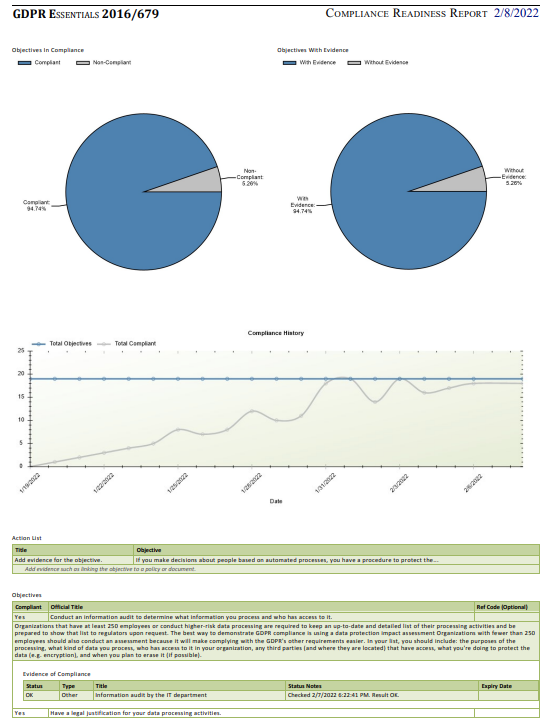 The top portion of the report has two pie charts: the left side showing the share of objectives that are in compliance, the right side showing the share of objectives that have evidence provided (whether valid or invalid evidence).