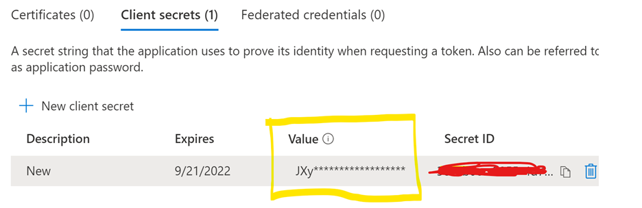 You should now see your client secret listed in the Value field. Copy this value and put it into the "Client Secret" box on Staff.Wiki's Web Services page.