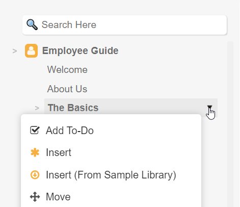 Use this action to insert a new page, which will always be done relative to an existing page. You'll also notice an action to insert by downloading a template from the cloud library. This lets you select a pre-written page from our library of policies, such as policies used in an Employment Manual.