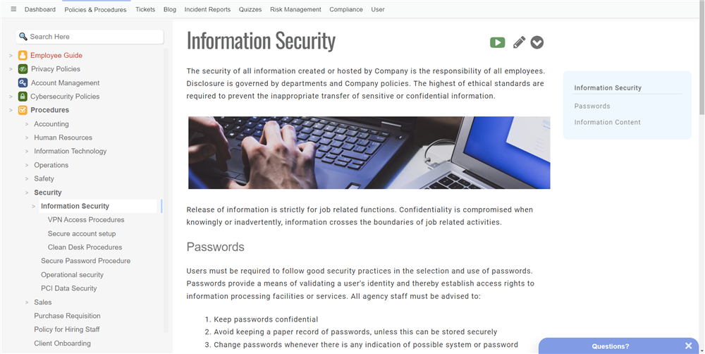 The Policies & Procedures tab displays a navigator to the left, and the content to the right side.